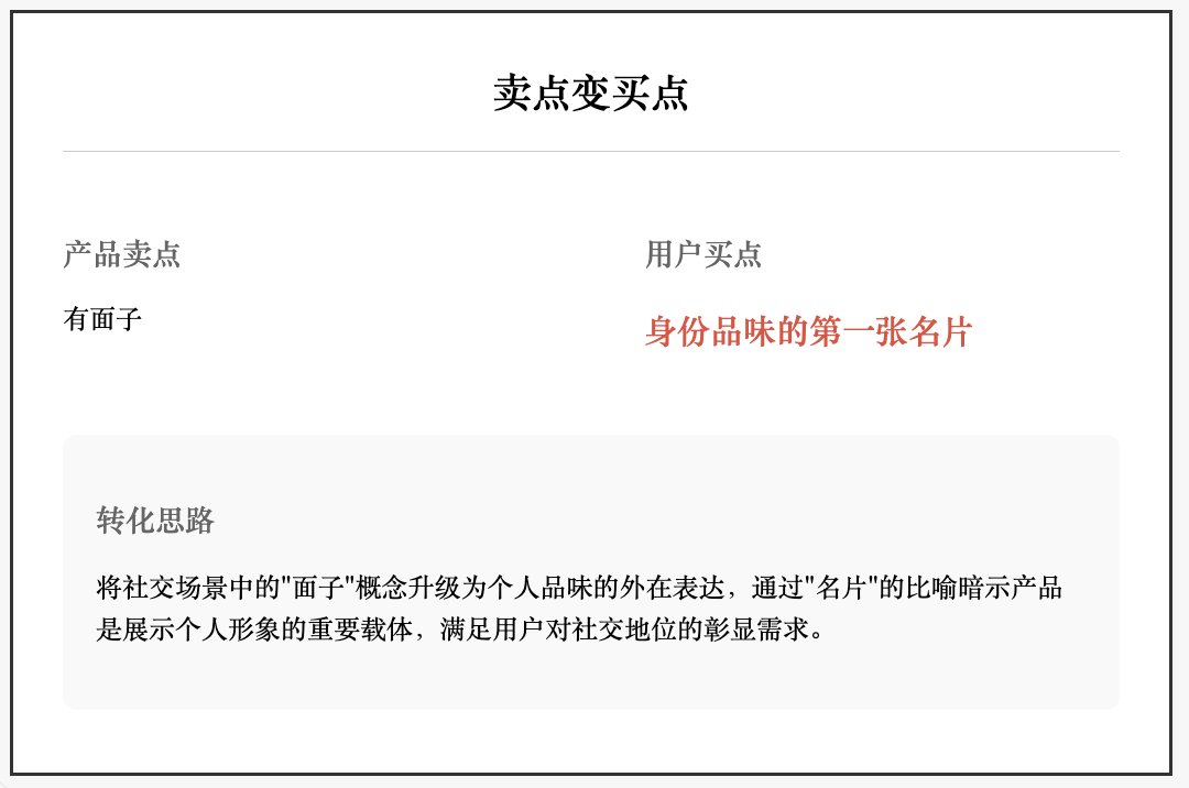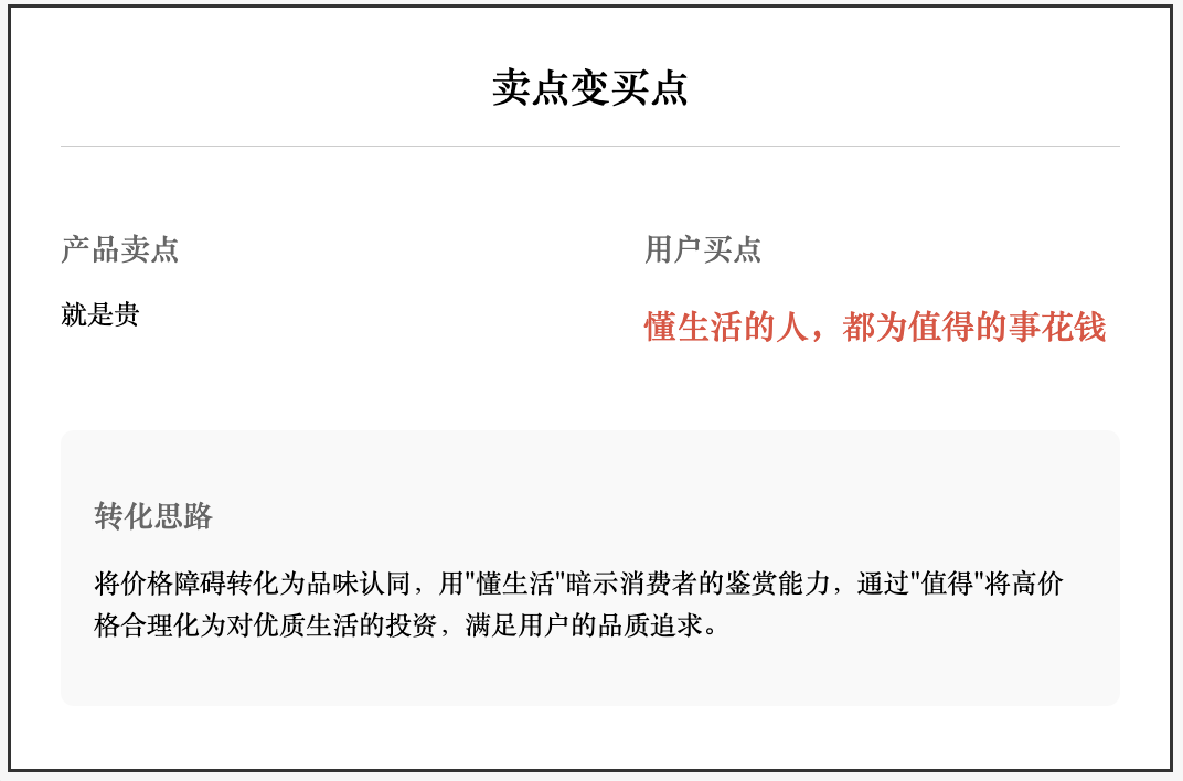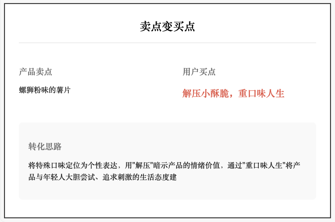 第二步,转化买点视角:将卖点转换成用户视角的买点,场景还原或者比喻类比,以击穿用户痛点
