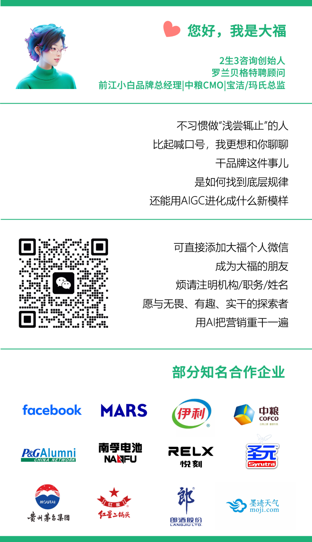 谢谢你看我的文章,期待你随手点赞、在看、转发三连!也期待你的关注,大福将持续更新自己在品牌营销领域的AI思考和实践,超干货!