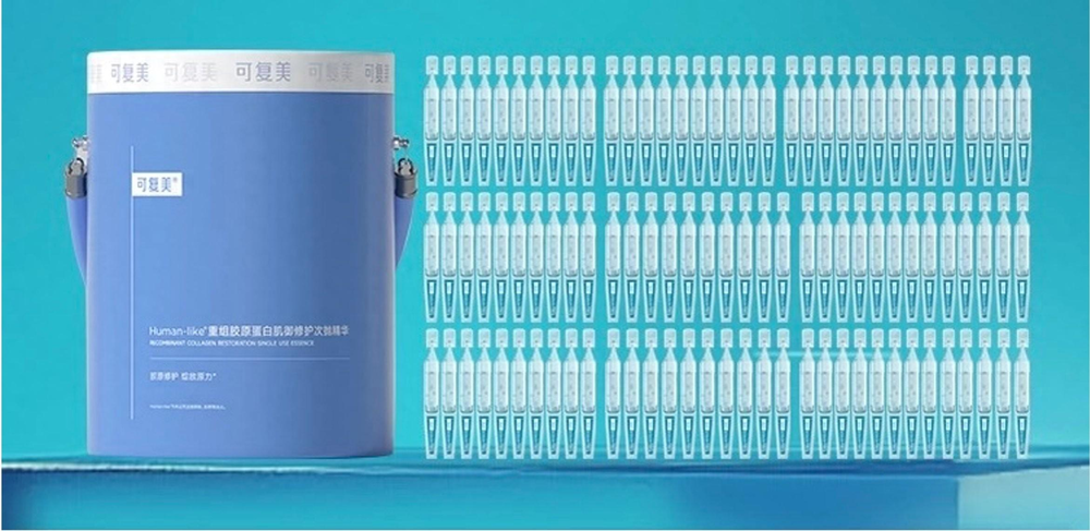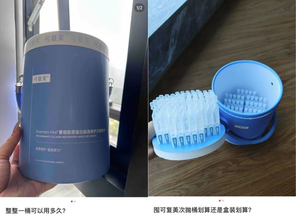 次抛太火爆,可复美甚至掀起了一种很硬核的售卖方式——不是论“盒”、不是论“箱”,而是论“桶”卖次抛,售价699元、100支/一桶的重组胶原蛋白次抛精华,照样被人抢购一空。