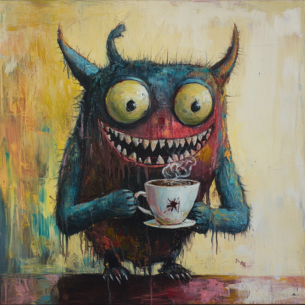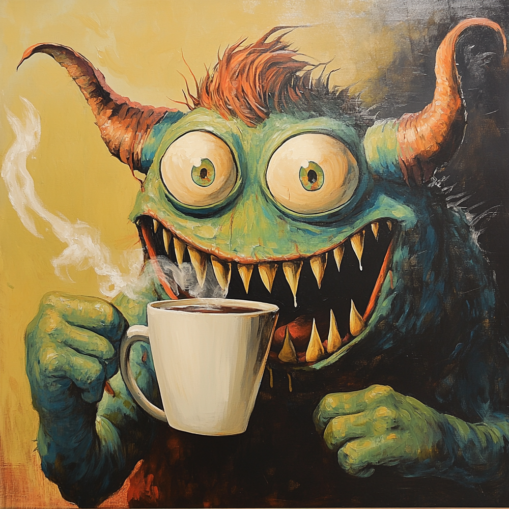 一只绿色的卡通怪物,有着夸张的大眼睛和橙色的弯曲犄角,露出满口尖牙的笑容。它正用绿色的爪子捧着一个白色的咖啡杯,杯子正冒着热气。背景是金黄色调,整体画风充满趣味性和艺术感。