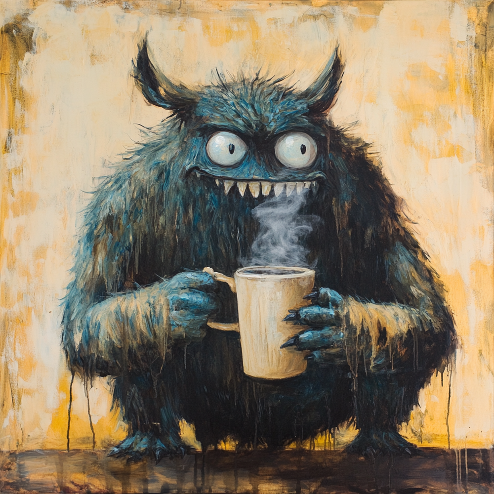 一只毛茸茸的蓝黑色大怪物,身材圆胖,全身覆盖着杂乱的毛发。它露出友好的笑容,正捧着一个大号的白色咖啡杯或马克杯。这幅画的风格更偏向可爱温暖,背景依然保持着温暖的金黄色调。