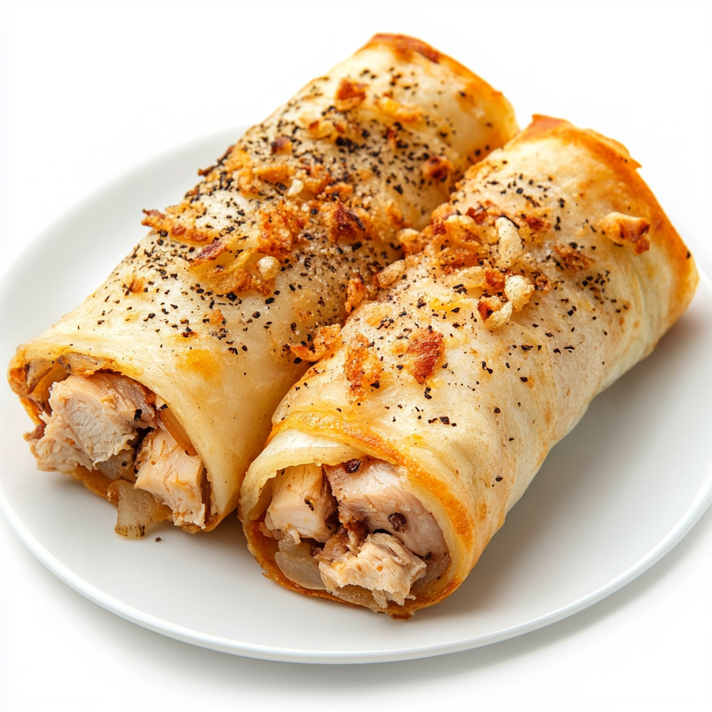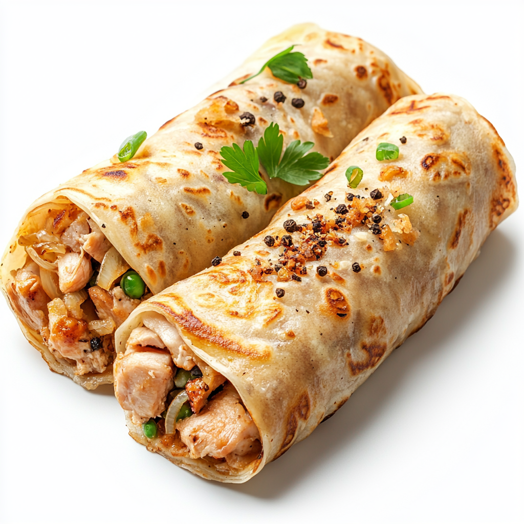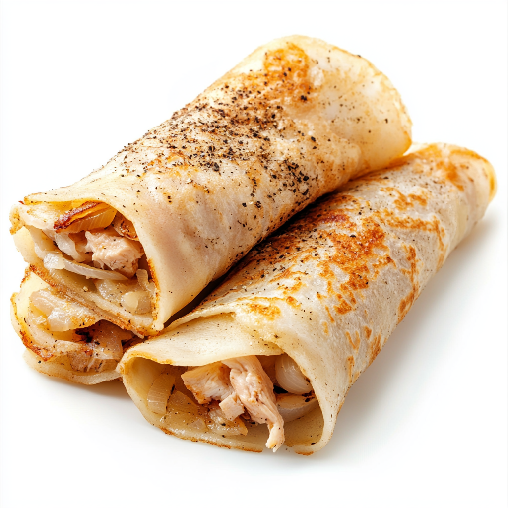 Prompt: Pancake rolls stuffed with pieces of boiled chicken meat with fried onions. Ground black pepper on top. isolated on white background. High resolution image, perfect stock photo