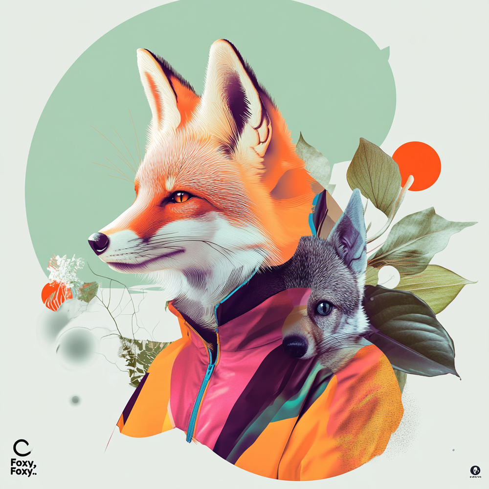 主体是一只红狐狸和一只浣熊的形象,狐狸穿着时尚运动外套,色彩以橙色和粉红色为主。背景采用了清新的薄荷绿色圆形,点缀着装饰性的叶子和几何图形。整体设计融合了写实与时尚元素,画面左下角标有"Foxy, Foxy"的标志。
