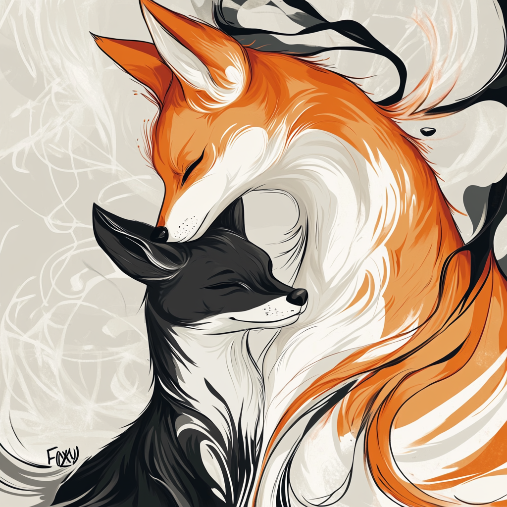 画面展现了一只红狐狸和一只黑狐狸亲密互动的场景,线条流畅优美,色彩对比鲜明。背景采用简约的灰白色调,充满诗意感。右下角签有"Foxy"的艺术签名。整体画面构图和谐,体现出温柔细腻的艺术气质。