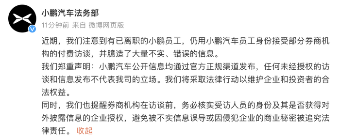 据界面新闻,12月2日,@小鹏汽车法务部 发文称,近期注意到有已离职的小鹏员工,仍用小鹏汽车员工身份接受部分券商机构的付费访谈,并臆造了大量不实、错误的信息。公司郑重声明,小鹏汽车公开信息均通过官方正规渠道发布,任何未经授权的访谈和信息发布不代表公司的立场。公司将采取法律行动以维护企业和投资者的合法权益。同时提醒券商机构在访谈前,务必核实受访人员的身份及其是否获得对外披露信息的企业授权,避免被不实信息误导或因侵犯企业的商业秘密被追究法律责任。