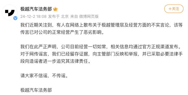据界面新闻,12月2日,极越汽车法务部官方微博发布消息称,“我们近期关注到,有人在网络上散布关于极越管理层及经营方面的不实言论,该等传言已对公司的正常经营产生了恶劣影响。我们在此严正声明,公司目前经营一切如常,相关信息均通过官方正规渠道发布。对于网传谣言,我们已经留存证据,向主管部门反映和举报,并已采取必要法律手段向造谣者进一步追究其法律责任。”