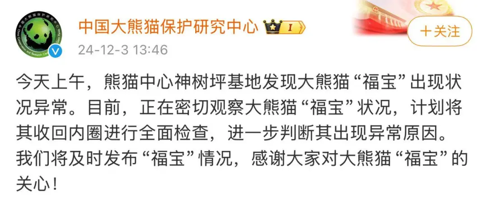 据大河报,据@中国大熊猫保护研究中心 消息,今天上午,熊猫中心神树坪基地发现大熊猫“福宝”出现状况异常。