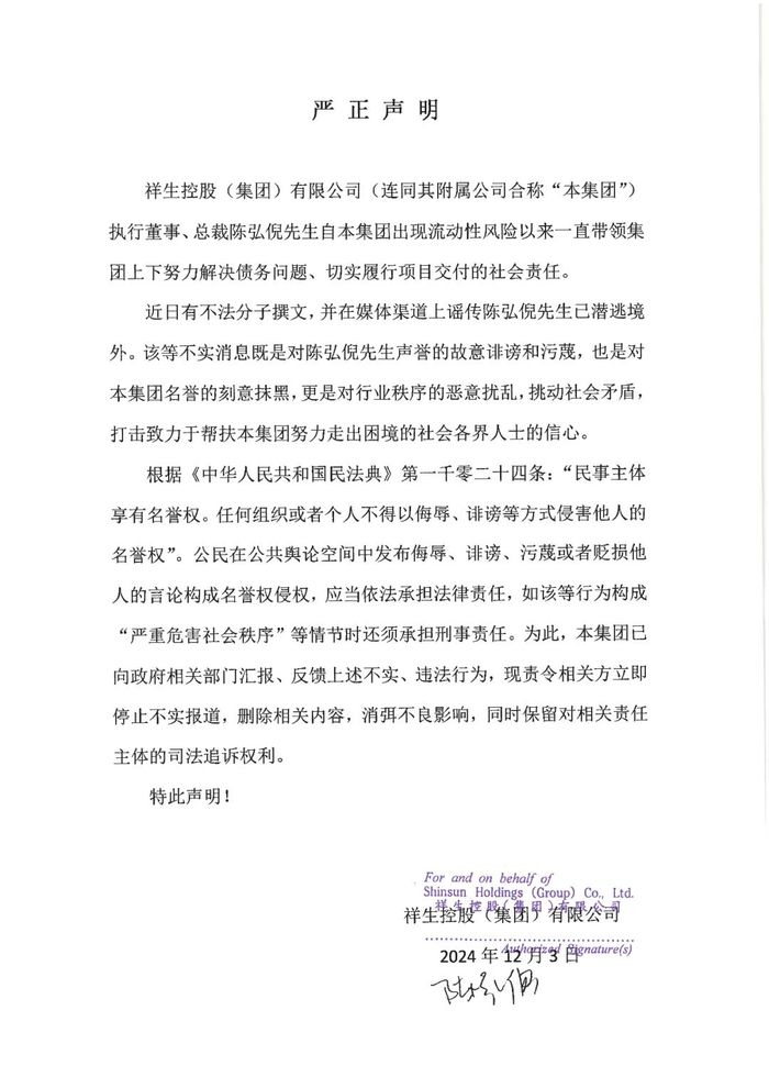 据界面新闻,12月3日,祥生控股集团发布声明称,近日有不法分子撰文,并在媒体渠道上谣传该集团执行董事、总裁陈弘倪先生已潜逃境外。集团已向政府相关部门汇报、反馈上述不实、违法行为。