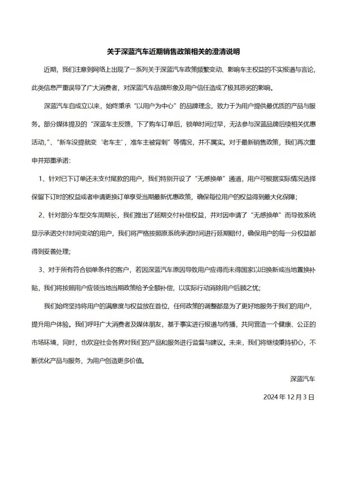 据界面新闻,12月3日,深蓝汽车就近期销售政策发布澄清说明,称部分媒体提及的“深蓝车主反馈,下了购车订单后,锁单时间过早,无法参与深蓝品牌后续相关优惠活动,”、“新车没提就变‘老车主’,准车主被背刺”等情况,并不属实。