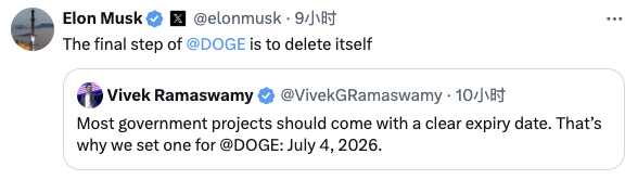 据界面新闻,美国企业家维维克·拉马斯瓦米(Vivek Ramaswamy)当地时间12月2日在社交平台上表示,大多数政府项目都应该有明确的完成日期,而他们为“政府效率部”(DOGE)设定的完成日期为2026年7月4日。马斯克随后转发该消息并表示,政府效率部的最后一步是删除它自身。