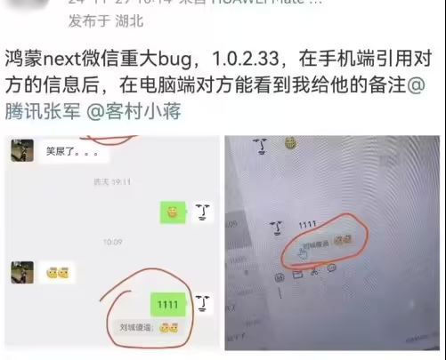 据IT之家援引浪涨科技报道,11月27日,有用户在个人社交账号反映,鸿蒙NEXT微信1.0.2.33版,在手机端引用对方的消息后,在电脑端对方能看到自己给他的备注。