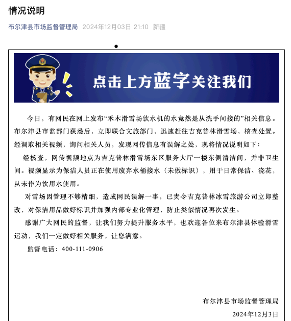 据界面新闻,12月3日,有网民在网上发布“禾木滑雪场饮水机的水竟然是从洗手间接的”相关信息。新疆阿勒泰布尔津县市场监督管理局发布情况说明称,经调取相关视频,询问相关人员,发现网传信息有误解之处。经核查,网传视频地点为吉克普林滑雪场东区服务大厅一楼东侧清洁间,并非卫生间。视频显示为保洁人员正在使用废弃水桶接水(未做标识),用于日常保洁、浇花,从未作为饮用水使用。对雪场因管理不够精细,造成网民误解一事,已责令吉克普林冰雪旅游公司立即整改,对保洁用品做好标识并加强内部专业化管理,防止类似情况再次发生。