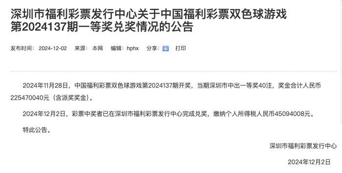 据界面新闻,12月2日,深圳市福利彩票发行中心发布公告称,2024年11月28日,中国福利彩票双色球游戏第2024137期开奖,当期深圳市中出一等奖40注,奖金合计人民币225470040元(含派奖奖金)。2024年12月2日,彩票中奖者已在深圳市福利彩票发行中心完成兑奖,缴纳个人所得税人民币45094008元。