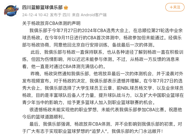 据界面新闻,12月4日,四川蓝鲸篮球俱乐部发布声明,回应杨政放弃CBA体测。声明称,昨晚杨政突然通知俱乐部,他将放弃最后一次的体测机会,并于凌晨对外发布视频宣布。对于杨政的决定,俱乐部表示遗憾并理解。“很遗憾杨政未能实现他的职业梦想,未能代表我俱乐部参加CBA比赛。祝愿他今后的篮球道路顺利。”