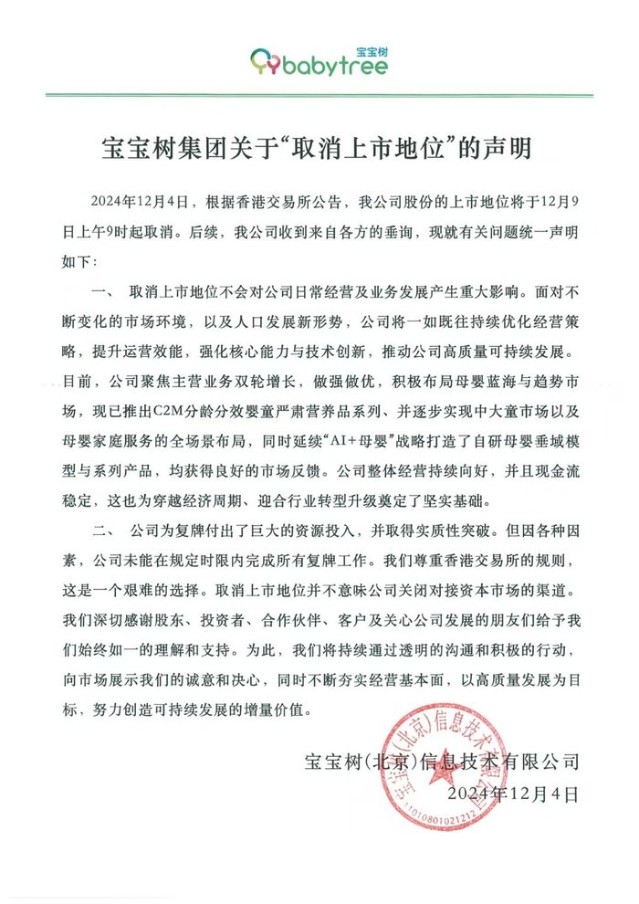 据界面新闻,12月4日晚间,宝宝树集团发布关于“取消上市地位”的声明。声明称,公司尊重香港交易所的规则,这是一个艰难的选择。取消上市地位并不意味公司关闭对接资本市场的渠道。取消上市地位不会对公司日常经营及业务发展产生重大影响。宝宝树集团称,公司整体经营持续向好,并且现金流稳定。