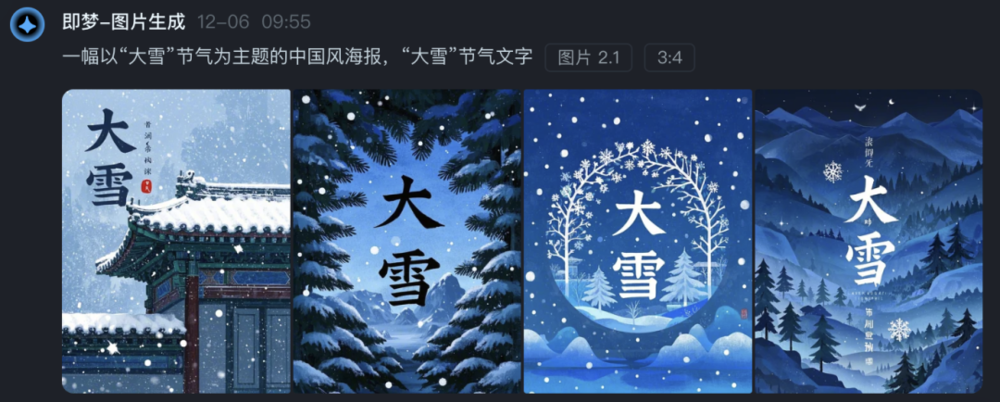 今天是大雪时节,让我们以节气海报为例,来测评下即梦AI 2.1的文字嵌入能力,还有超一线的图片生成质量。