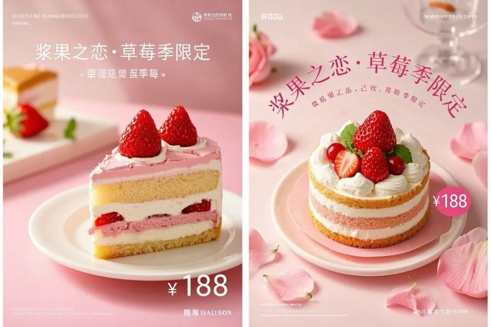 草莓蛋糕新品海报,小清新风格,45度俯拍视角,柔和自然光,粉色小清新色调,虚化背景,突出甜点质感,留白设计,文案"浆果之恋·草莓季限定",优雅字体,简约排版,右下角添加价格"¥188"