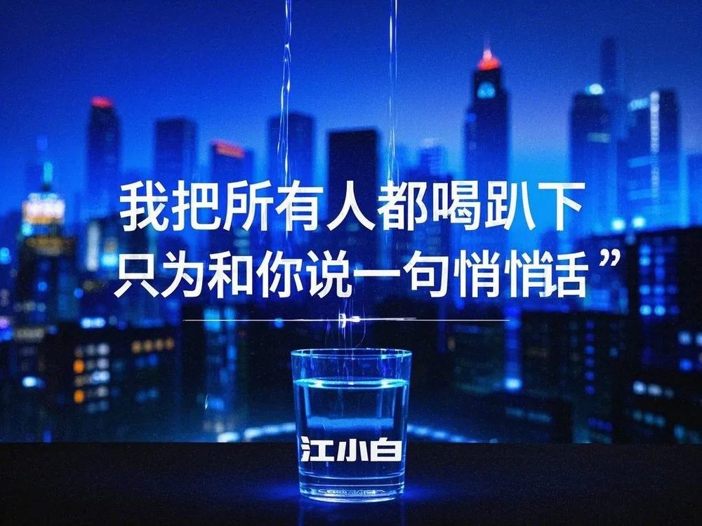 酒类情感海报,现代潮流设计,深蓝渐变背景,霓虹灯效果,磨砂玻璃质感,城市夜景剪影,白酒杯光影,潮流动感字体,故障艺术元素,文案"我把所有人都喝趴下,只为和你说一句悄悄话",右下角品牌"江小白"霓虹灯效果,赛博朋克风格。