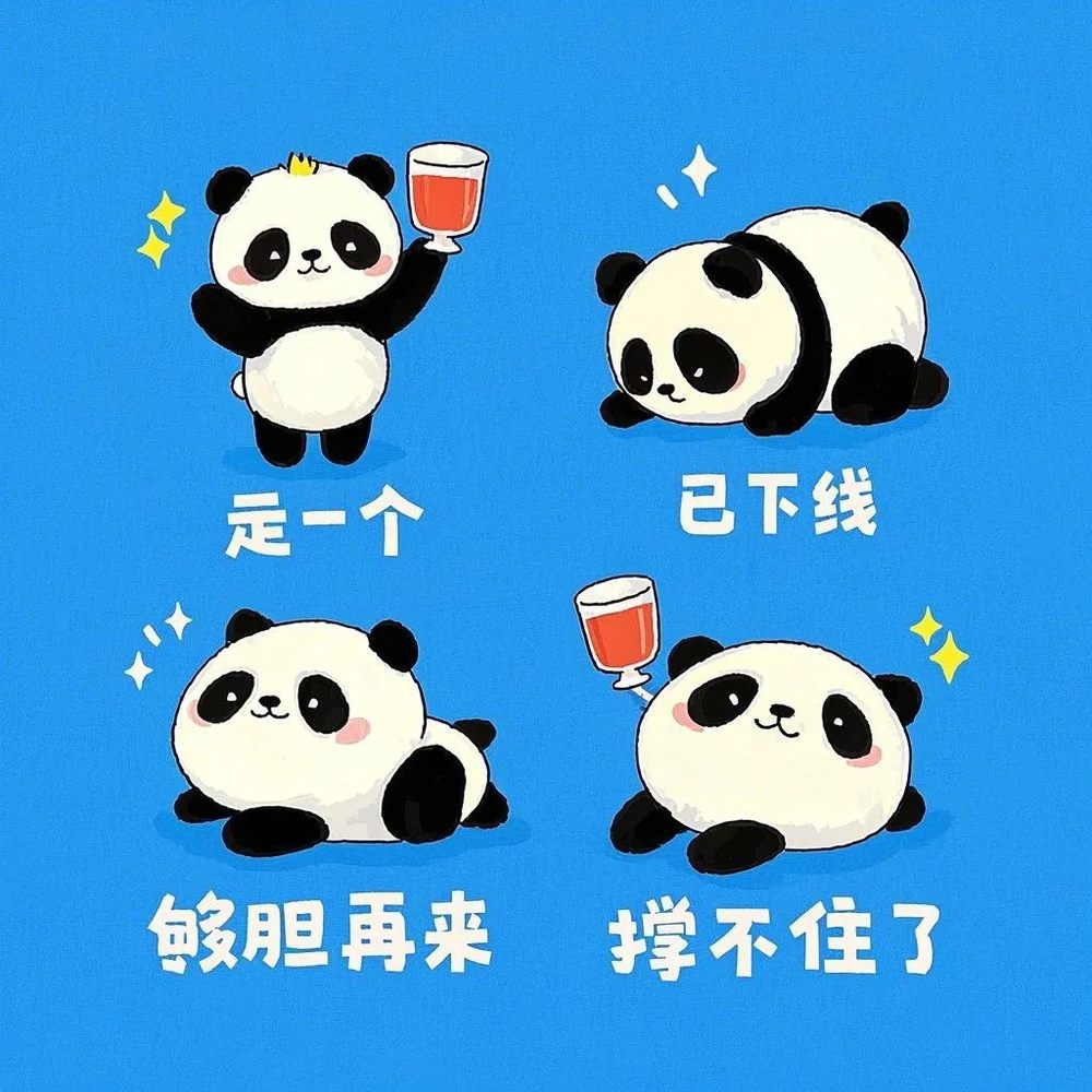 卡通风格表情包,可爱小熊猫角色,四宫格布局,清新背景色,Q版简约设计,俏皮动作,文字分别是"走一个""够胆再来""撑不住了""已下线",手写可爱字体,整体保持统一欢乐的饮酒主题风格。