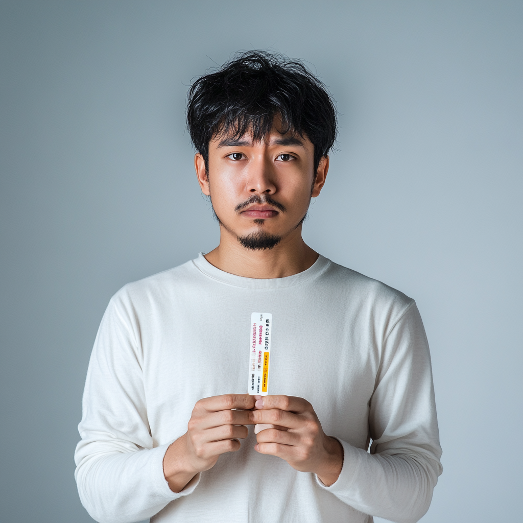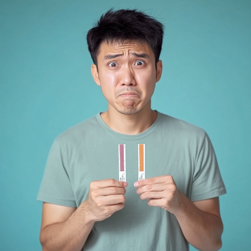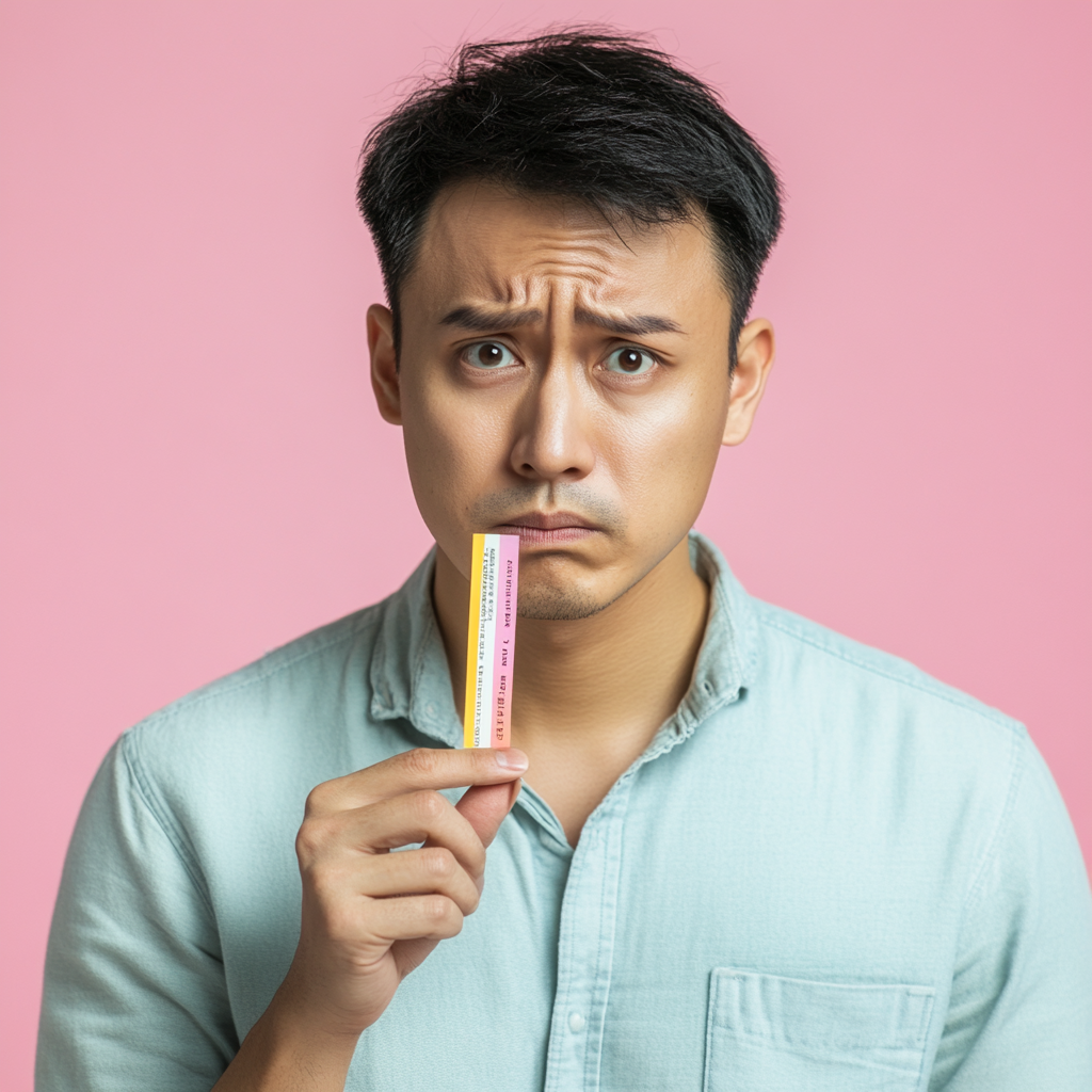 Prompt: Asian people look sick, when his body's pH is unbalanced, , realistic, showing ph strip to camera
