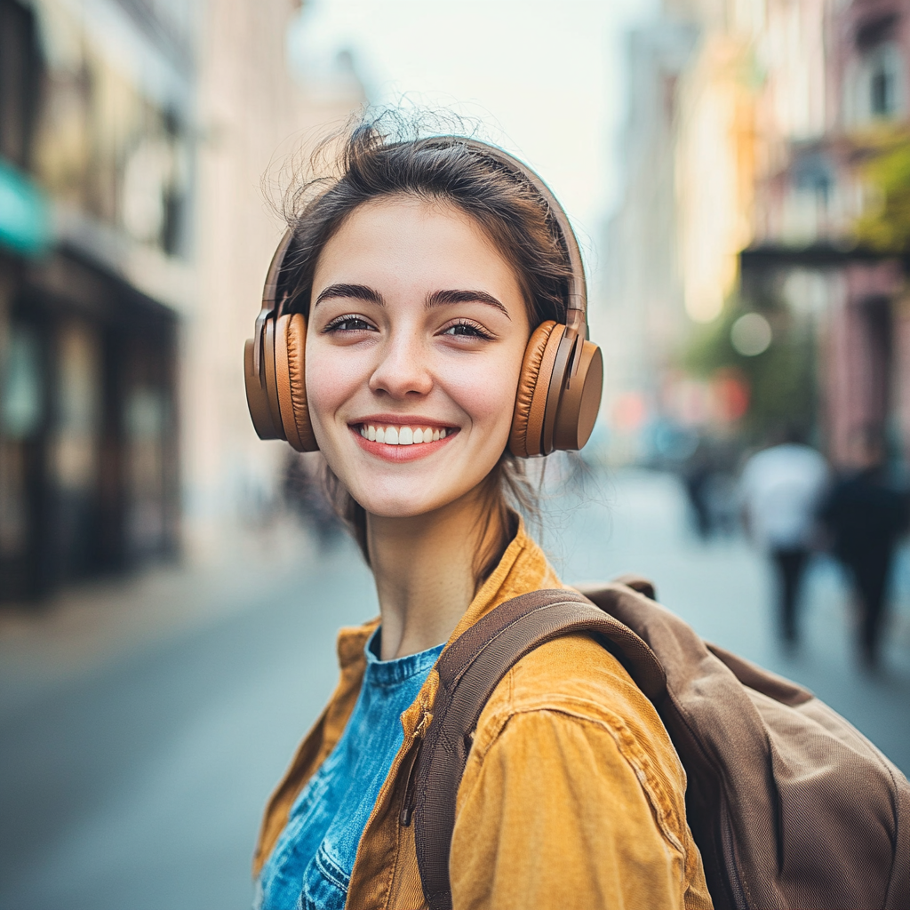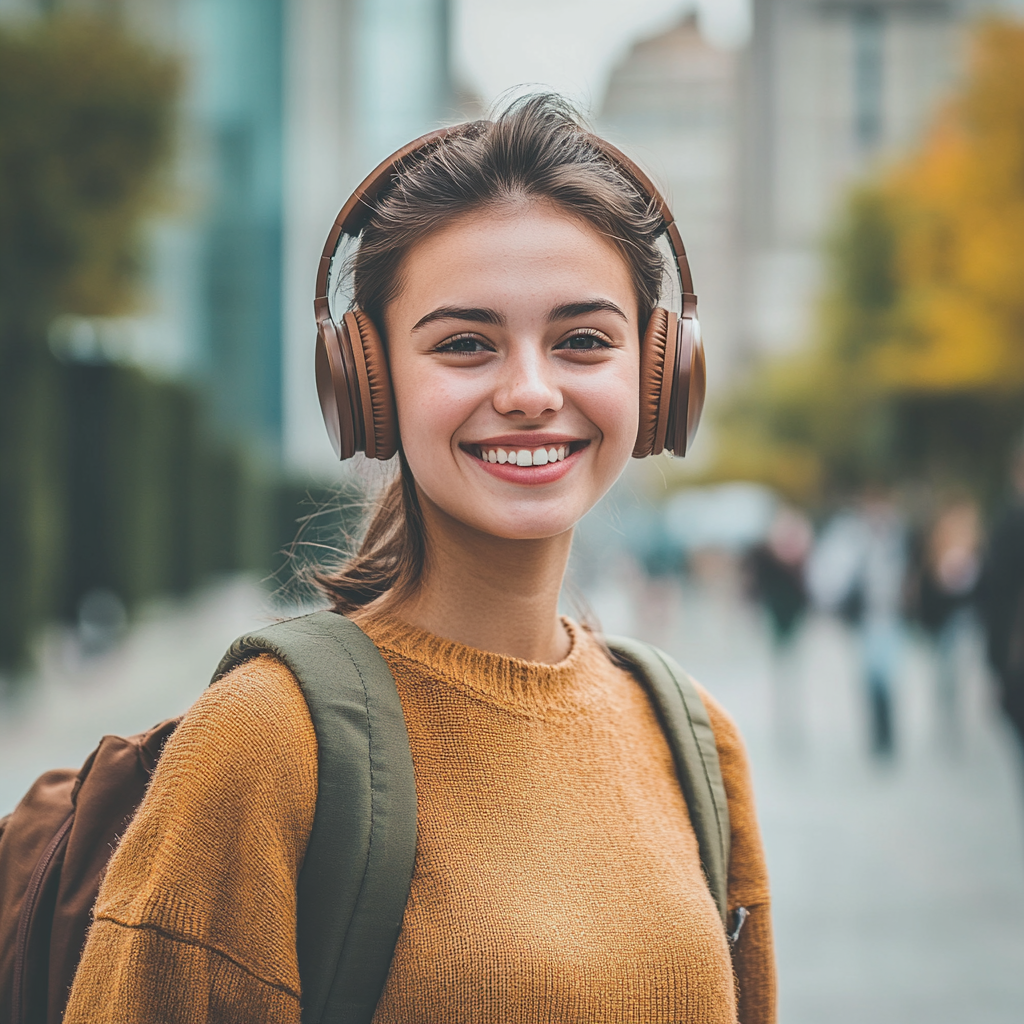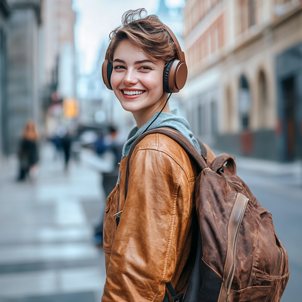 Prompt: A beautiful and happy young woman wearing brown headphones and carrying a backpack stood on the street, smiling at the camera. The background is blurred by the urban landscape, creating a sense of depth. He has short hair and is wearing casual clothes that match the color of his headphones very well. When he smiled and looked at the photo, his eyes sparkled, conveying the calmness and happiness of being a worker. This scene conveys youthful vitality and exudes a cool casual style.