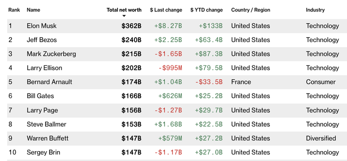 据界面新闻,彭博亿万富翁指数显示,截至当地时间12月6日,全球首富、特斯拉CEO马斯克的净资产已超3600亿美元,较居次位的杰夫·贝佐斯高出1220亿美元,年初至今累计增加1333亿美元。