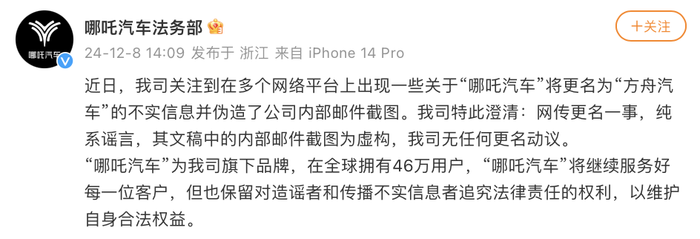 据界面新闻,12月8日,@哪吒汽车法务部 发文称,近日,公司关注到在多个网络平台上出现一些关于“哪吒汽车”将更名为“方舟汽车”的不实信息并伪造了公司内部邮件截图。特此澄清:网传更名一事,纯系谣言,其文稿中的内部邮件截图为虚构,公司无任何更名动议。