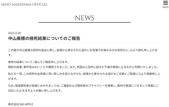 据界面新闻,日本女演员中山美穂日前被发现在家中死亡,年仅54岁。12月8日,中山美穗的事务所公布,其死因被判定为“洗澡时发生的意外事故”。事务所同时称,不会透露葬礼的时间和地点,恳请媒体和粉丝理解与配合。