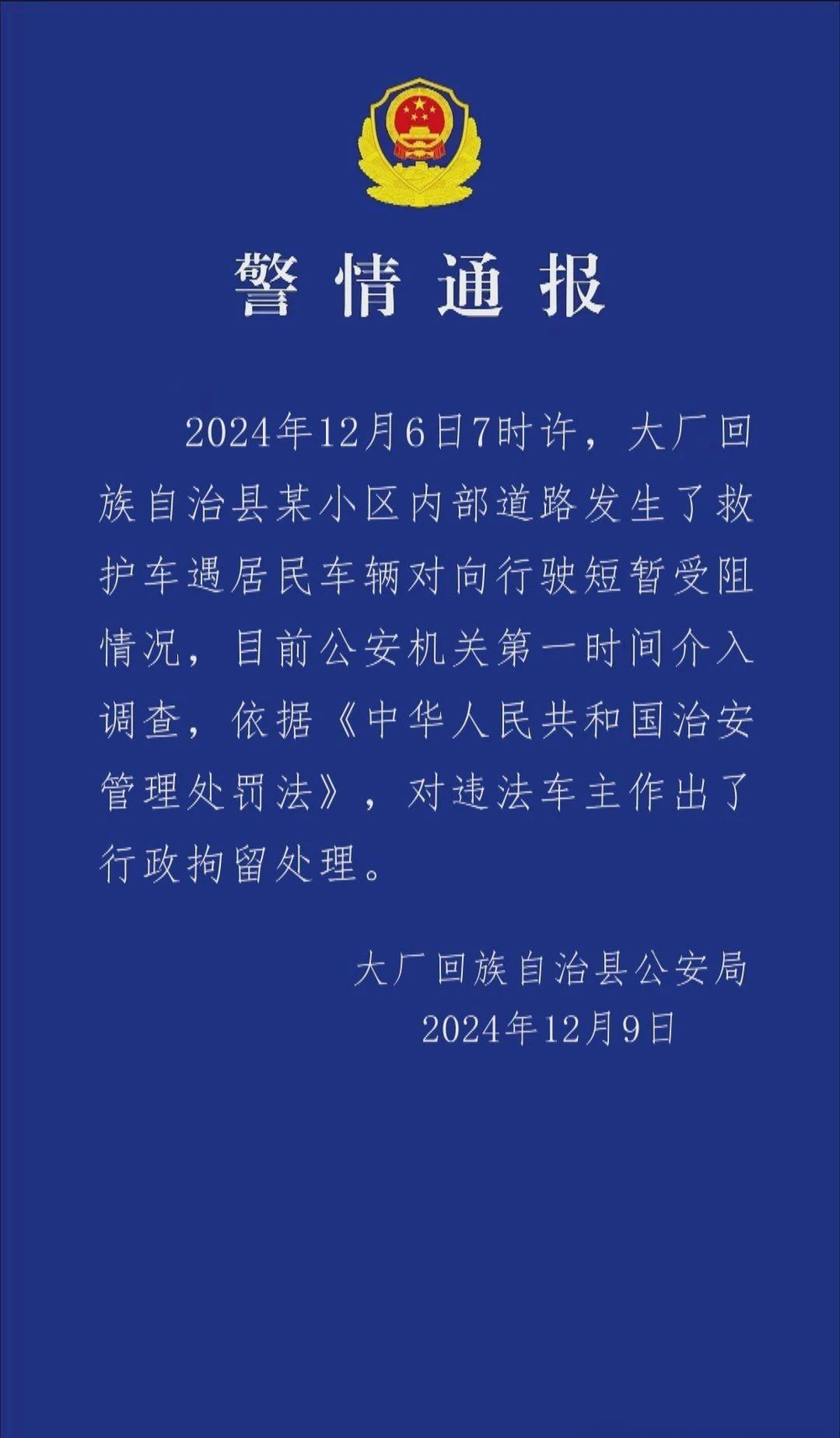 据央视新闻,河北大厂回族自治县公安局12月9日通报,12月6日7时许,大厂回族自治县某小区内部道路发生了救护车遇居民车辆对向行驶短暂受阻情况,目前公安机关第一时间介入调查,依据《中华人民共和国治安管理处罚法》,对违法车主作出了行政拘留处理。