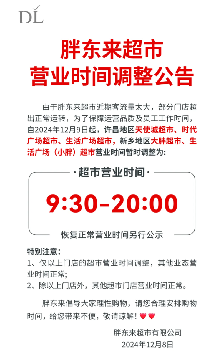 据界面新闻,12月9日,根据胖东来超市营业时间调整公告,由于胖东来超市近期客流量太大,部分门店超出正常运转,为了保障运营品质及员工工作时间,自2024年12月9日起,许昌地区天使城超市、时代广场超市、生活广场超市,新乡地区大胖超市、生活广场(小胖)超市营业时间暂时调整为:9:30-20:00。恢复正常营业时间另行公示。胖东来在公告中称,倡导大家理性购物,合理安排购物时间。
