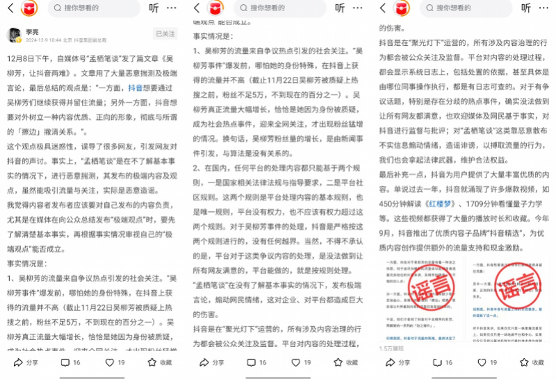 有自媒体发文称,“一方面,抖音想要通过吴柳芳们继续获得并留住流量;另外一方面,抖音想要对外树立一种内容优质、正向的形象,彻底与所谓的‘擦边’撇清关系”。对此,李亮表示,该观点是“恶意造谣”。