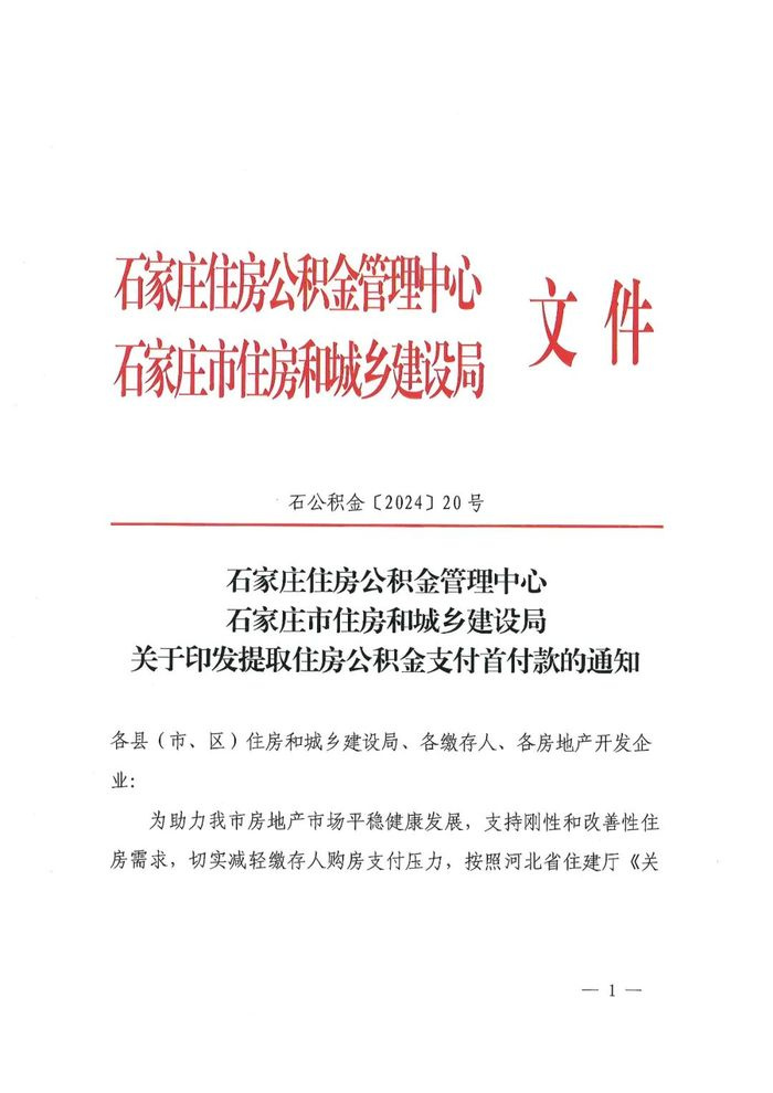 据界面新闻,河北省石家庄住房公积金管理中心12月11日发布《关于提取住房公积金支付购房首付款的通知》,在本市行政区域内购买新建商品住房的住房公积金缴存人,可申请提取本人及其配偶名下住房公积金支付购房首付款。本通知自2024年12月25日起实施。