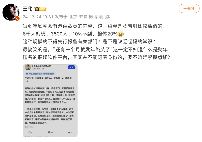 据界面新闻,12月24日,小米集团公关部总经理王化发文辟谣“小米年底裁员”传闻。王化表示:“每到年底就会有造谣裁员的内容,这一篇算是我看到比较离谱的。6千人规模、3500人、10%不到、整体20%这种规模的不得先行报备有关部门?是不是缺乏起码的常识?最搞笑的是,‘还有一个月就发年终奖了’这一定不知道什么是财年!匿名的职场软件平台,其实并不能隐藏身份的,要不咱赶紧攒点钱? ”