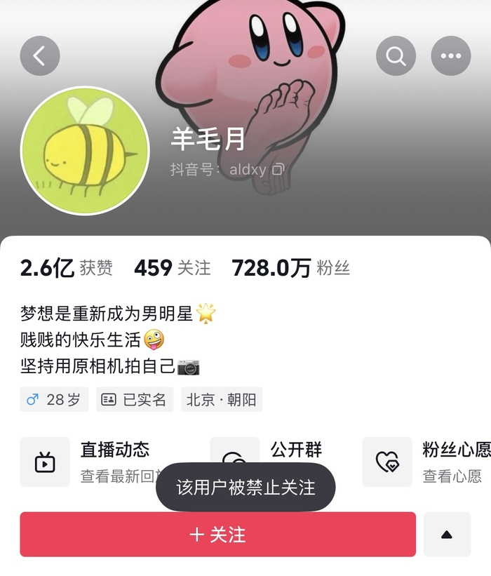 据界面新闻,12月24日消息,网红博主“羊毛月”的抖音账号主页显示,该用户被禁止关注。