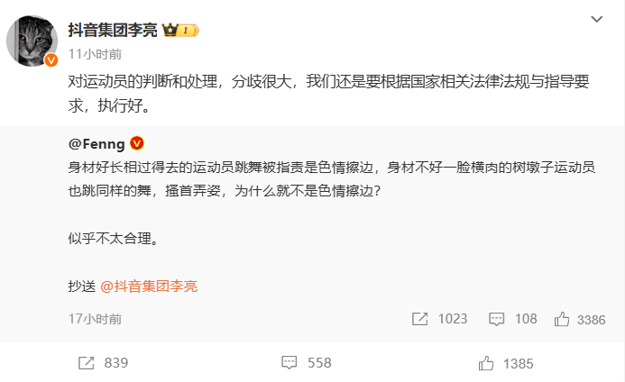 当晚,抖音集团副总裁李亮在微博回应网友称:“对运动员的判断和处理,分歧很大,我们还是要根据国家相关法律法规与指导要求,执行好。”