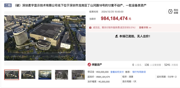 据界面新闻,12月25日,阿里资产平台显示,柔宇显示名下位于深圳市龙岗区丁山河路18号的12套不动产、一批设备类资产的第二次拍卖于今日10时结束,因无人出价再度流拍。据了解,此次拍卖起拍价由首拍的12.30亿元降至约9.84亿元。