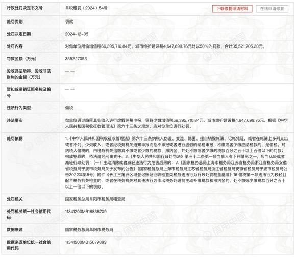 据界面新闻,信用中国网站显示,12月5日,阜阳市春天食品有限公司因偷税,被国家税务总局阜阳市税务局稽查局罚款3552.17万余元。处罚事由显示,该单位通过隐匿真实收入进行虚假纳税申报,导致少缴增值税6639.57万余元、城市维护建设税464.76万余元。