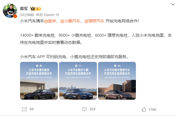 据e公司,12月25日,小米汽车相继宣布,与蔚来、小鹏、理想三大汽车厂商正式开始充电补能网络合作。