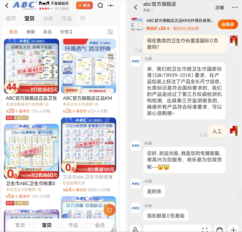 据红星新闻,今日,ABC天猫官方旗舰店产品重新上架,产品页不再显示“缺货”状态,可下单购买。红星资本局询问ABC官方旗舰店客服,目前售卖的卫生巾长度是否为国标0负差,ABC官方旗舰店客服表示:“现在都是0负差。”