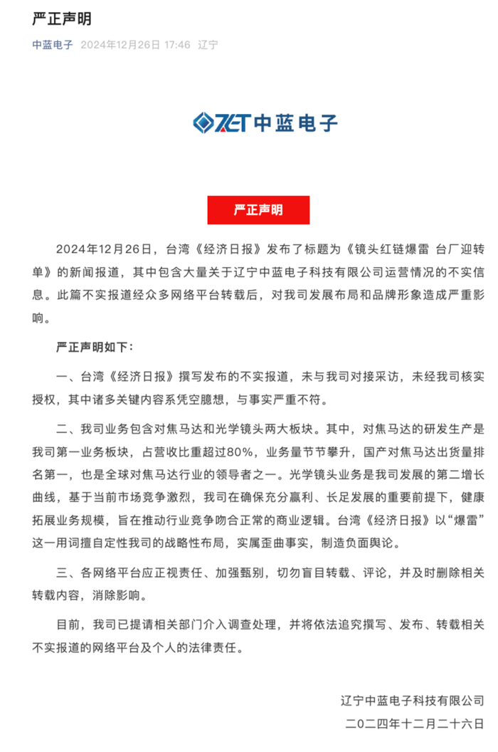 据界面新闻,12月26日下午,中蓝电子发布声明称,相关报道关于公司运营情况的信息不实。声明称,公司业务包含对焦马达和光学镜头两大板块。其中,对焦马达的研发生产是公司第一业务板块,占营收比重超过80%。光学镜头业务是公司发展的第二增长曲线,“基于当前市场竞争激烈,我司在确保充分赢利、长足发展的重要前提下,健康拓展业务规模,旨在推动行业竞争吻合正常的商业逻辑”。中蓝电子表示,相关报道以“爆雷”这一用词擅自定性公司的战略性布局,实属歪曲事实,制造负面舆论。目前,公司已提请相关部门介入调查处理,并将依法追究撰写、发布、转载相关不实报道的网络平台及个人的法律责任。