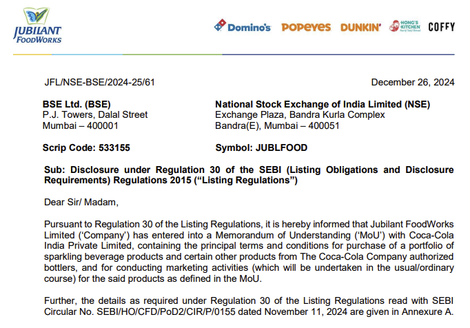 据界面新闻,12月26日,印度餐饮巨头Jubilant FoodWorks宣布,公司已与可口可乐印度私人有限公司签订谅解备忘录,其中包含从可口可乐公司授权装瓶商处收购汽水业务组合和某些其他产品,以及就谅解备忘录中定义的上述产品开展营销活动的主要条款和条件。据了解,Jubilant FoodWorks旗下拥有达美乐比萨、唐恩都乐等多个快餐品牌在印度的特许经营权。