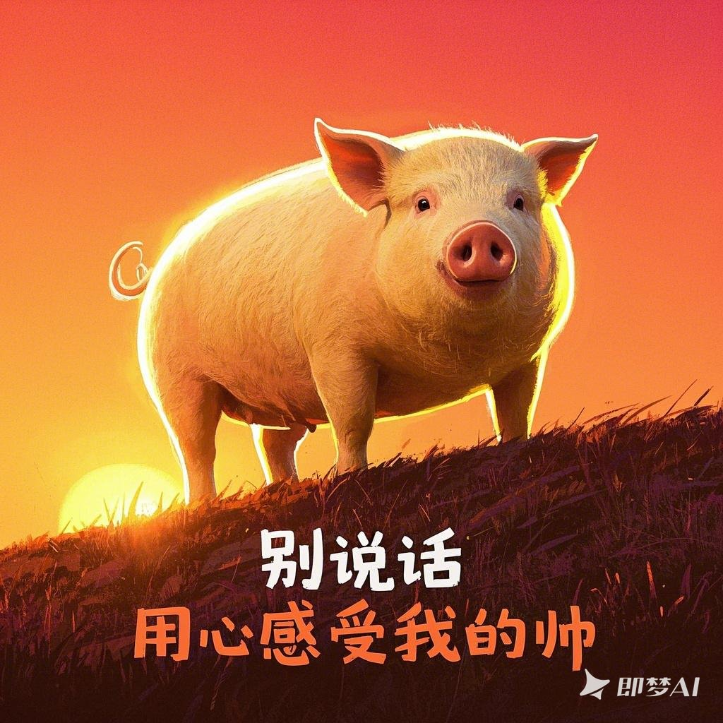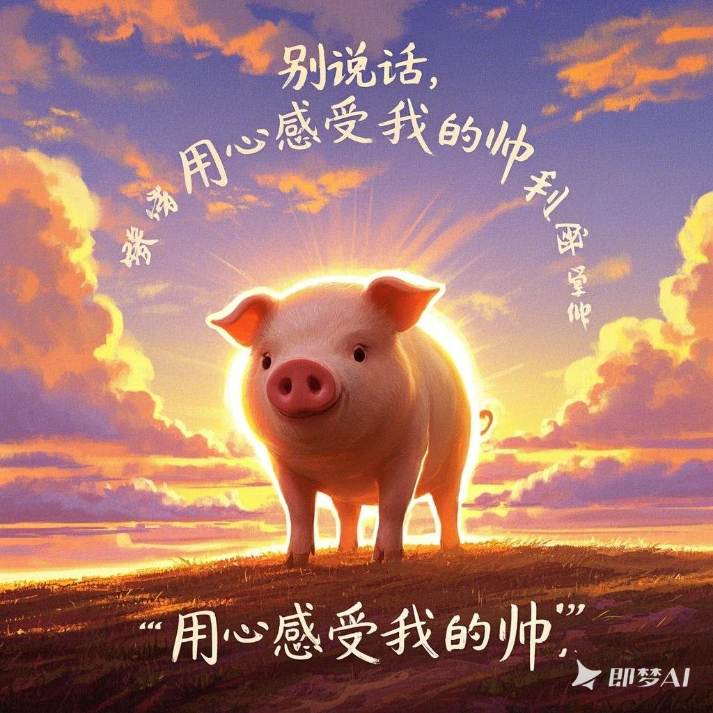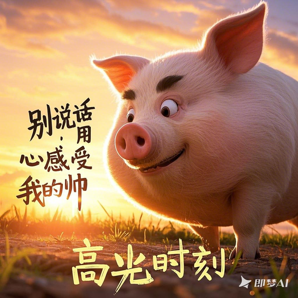 提示词: 一只猪站在镜头前,背景是夕阳,光线正好打在它身上,显得特别“高光时刻”旁边文字:“别说话,用心感受我的帅”