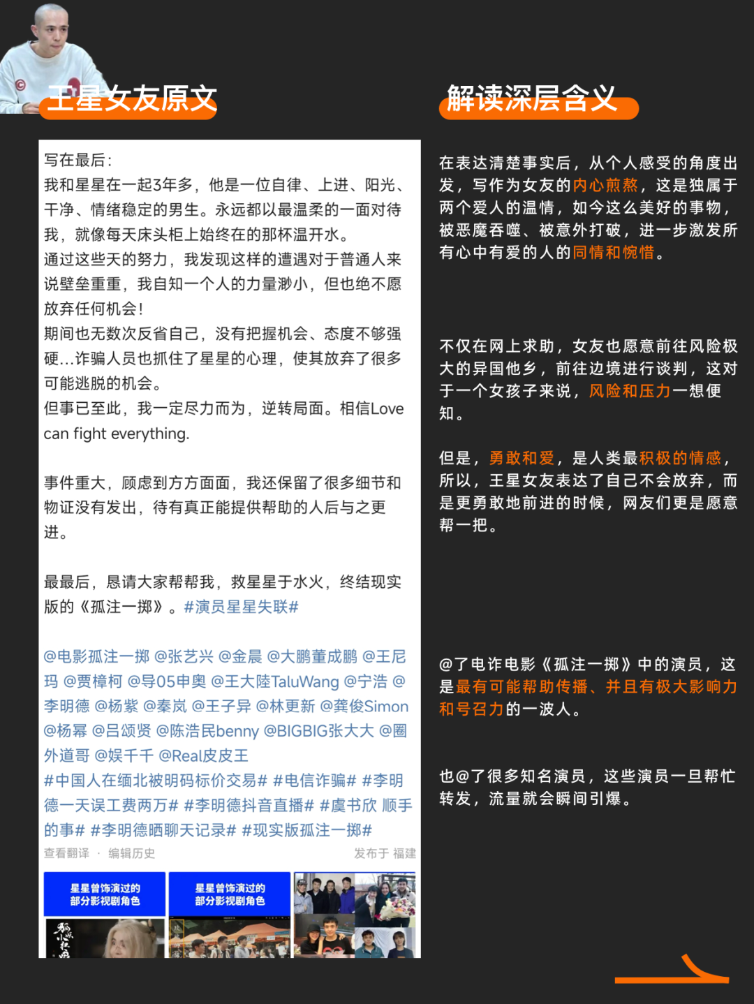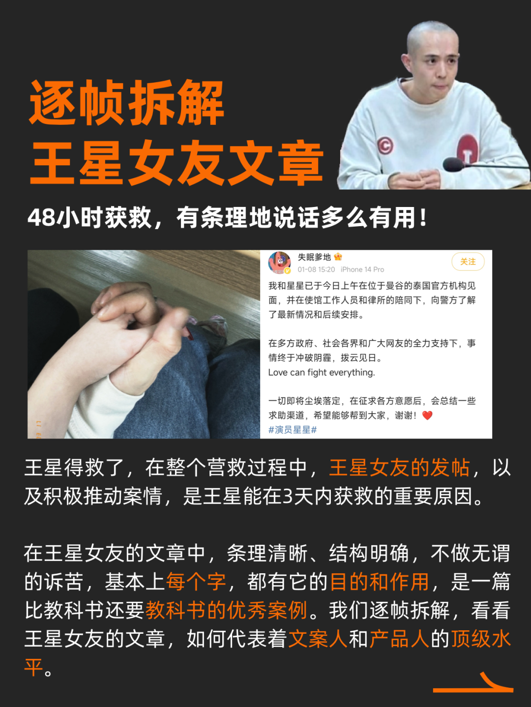 在王星女友的文章中,条理清晰、结构明确,不做无谓的诉苦,基本上每个字,都有它的目的和作用,是一篇比教科书还要教科书的优秀案例。我们逐帧拆解,看看王星女友的文章,如何代表着文案人和产品人的顶级水平。
