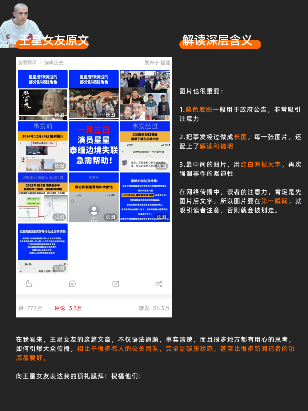在我看来,王星女友的这篇文章,不仅语法通顺,事实清楚,而且很多地方都有用心的思考,如何引爆大众传播,相比于很多名人的公关团队,完全是碾压状态,甚至比很多新闻记者的功底都要好。