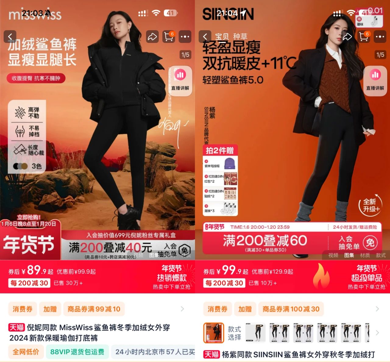 当大家夏天四处找防晒装备时,品牌们推出的鲨鱼裤也会声称带防晒功能。一款猫人的防晒鲨鱼裤就称,它不但有UPF50+的防晒指数,能“有效隔绝98%的紫外线”,还采用了冰丝技术,夏天穿时能保持凉爽。到了冬天,它们又普遍采用了加绒面料,有了保暖功能,如今视频号上最常见的一类鲨鱼裤广告,便是一个女生穿上带绒的鲨鱼裤,腿却比穿普通紧身裤还要细。