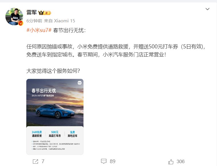 据第一财经,小米雷军发布微博称,小米su7春节出行无忧,任何原因抛锚或事故,小米免费提供道路救援,并赠送500元打车券(5日有效),免费送车到指定城市。春节期间,小米汽车服务门店正常营业。