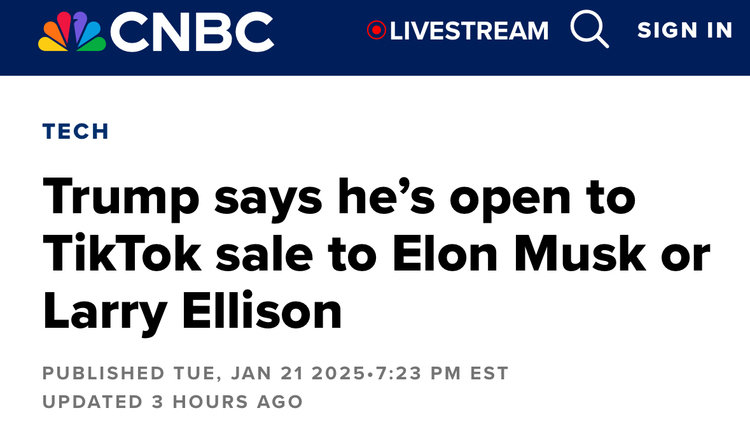 据美国消费者新闻与商业频道(CNBC)报道,在宣布成立一家投资人工智能基础设施的合资企业的新闻发布会上,一名记者问特朗普是否对“埃隆收购TikTok”持开放态度。
