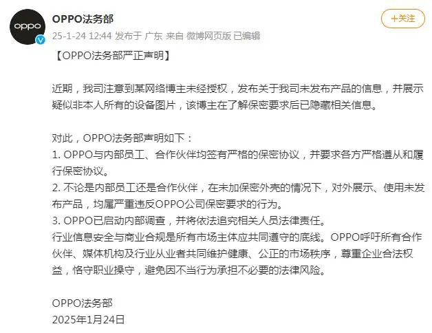 据证券时报,1月24日,OPPO法务部发文称,近期,我司注意到某网络博主未经授权,发布关于我司未发布产品的信息,并展示疑似非本人所有的设备图片,该博主在了解保密要求后已隐藏相关信息。