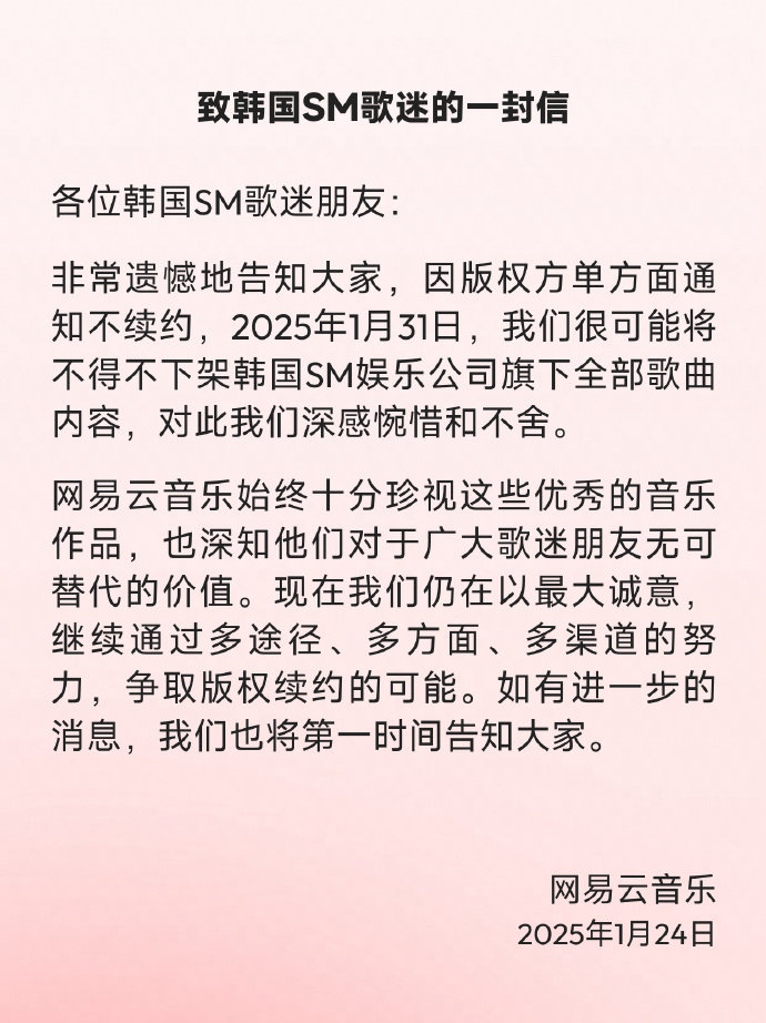 据界面新闻,1月24日,网易云音乐发布《致韩国SM歌迷的一封信》,称因版权方SM娱乐单方面通知不续约,平台很可能不得不于1月31日下架SM娱乐公司旗下全部歌曲内容。