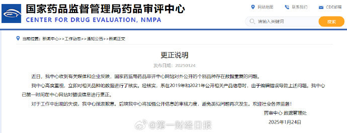 据第一财经,国家药品监督管理局药品审评中心官网,药审中心数据管理处发布更正说明称,近日,中心收到有关媒体和企业反映,国家药监局药品审评中心网站对外公开的个别品种存在数据重复的问题。中心高度重视,立即对相关品种的数据进行了核实。经核实,系在2019年和2021年公开相关产品信息时,由于编辑错误导致上述问题。中心已第一时间在中心网站对错误信息进行更正。对于工作中出现的失误,中心深表歉意。后续中心将加强公开信息的审核力度,避免类似问题再次发生。欢迎社会各界监督!